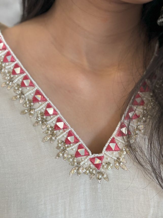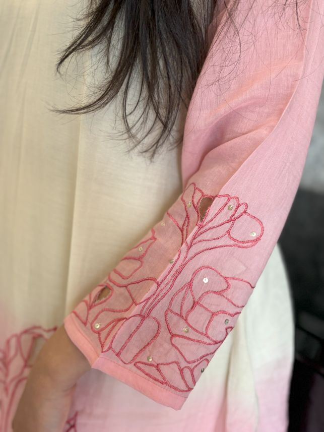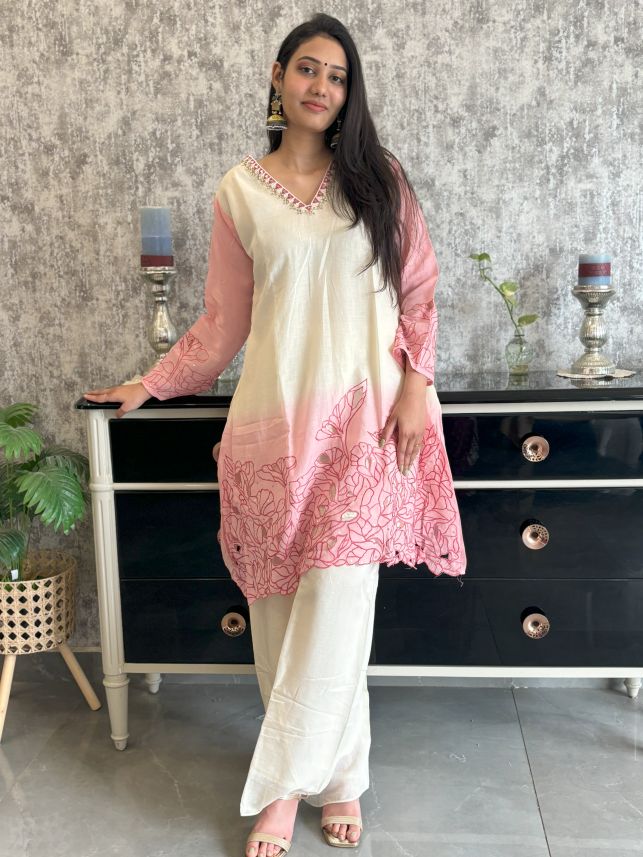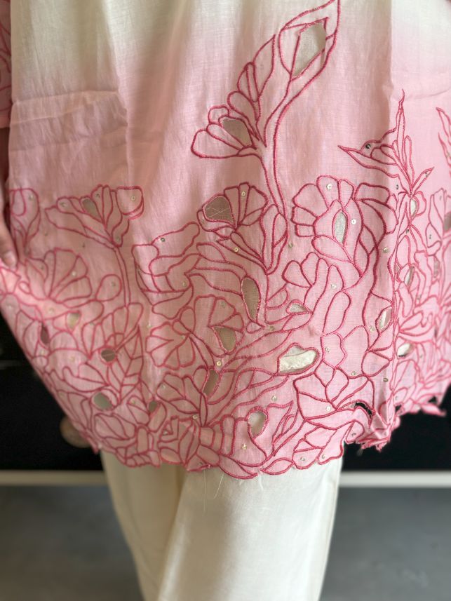 Pure Mul Chanderi Cut Work Hand Embroidered Co-ord Set in Off-White and Pink