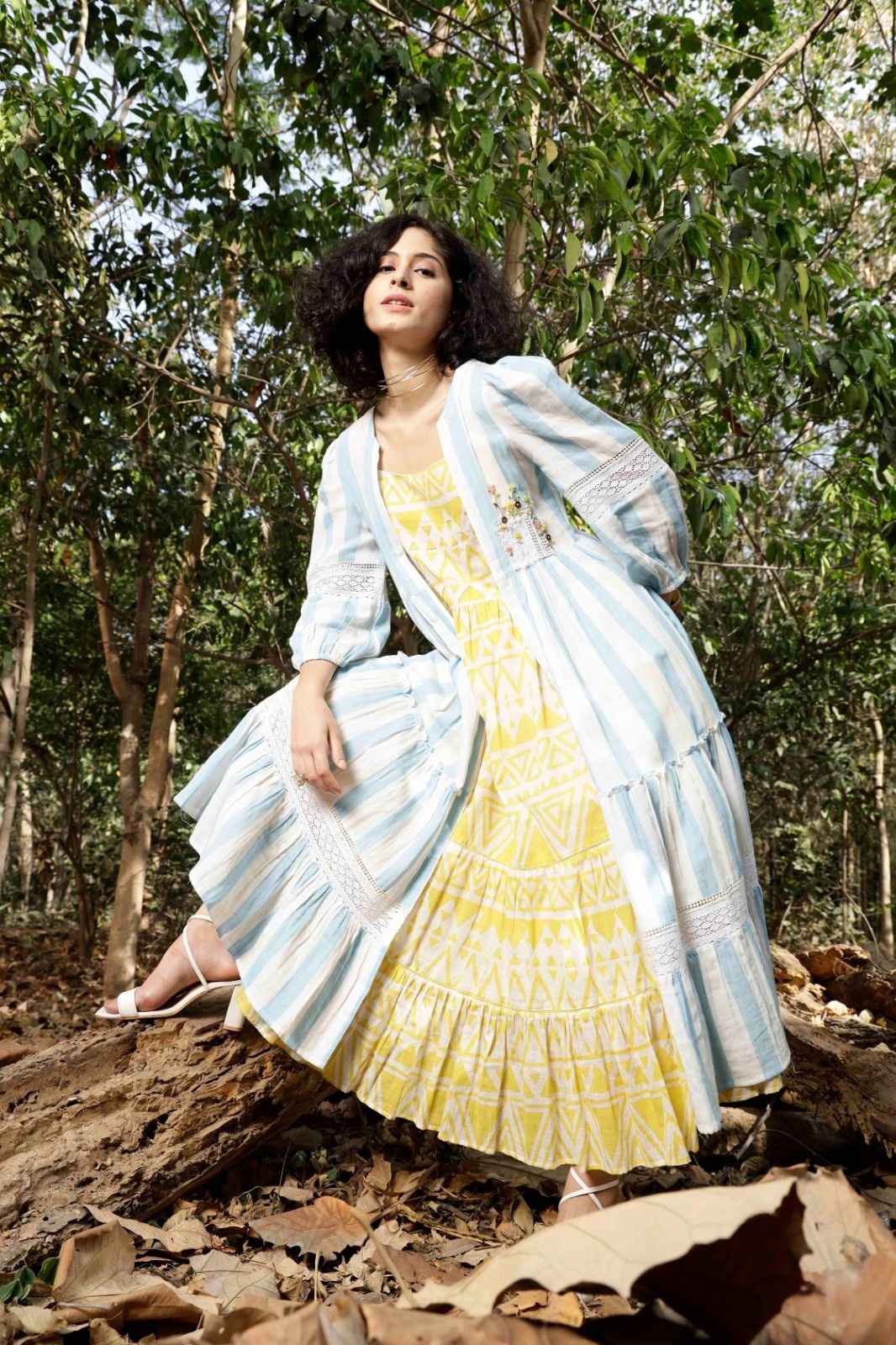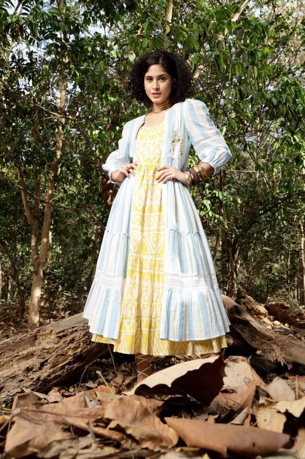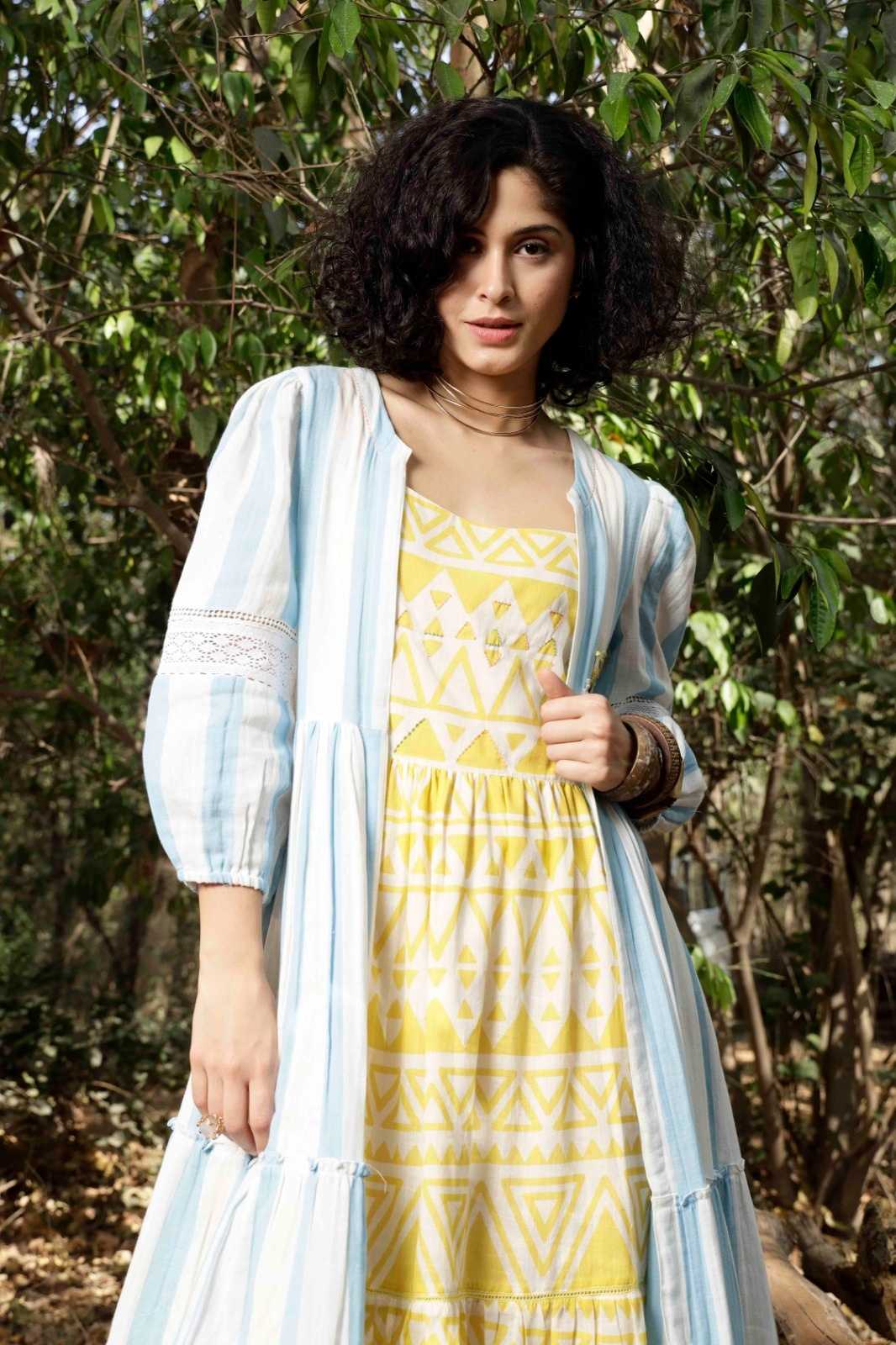 Pure Cotton Shrug Dress With Cotton Tiered Inner With Katha Work Paired With Mul Cotton Shrug