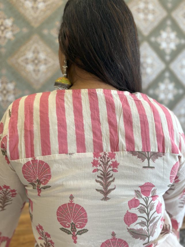 Pure Cotton Block Print Pant Set With Striped Cotton Pants in Pink