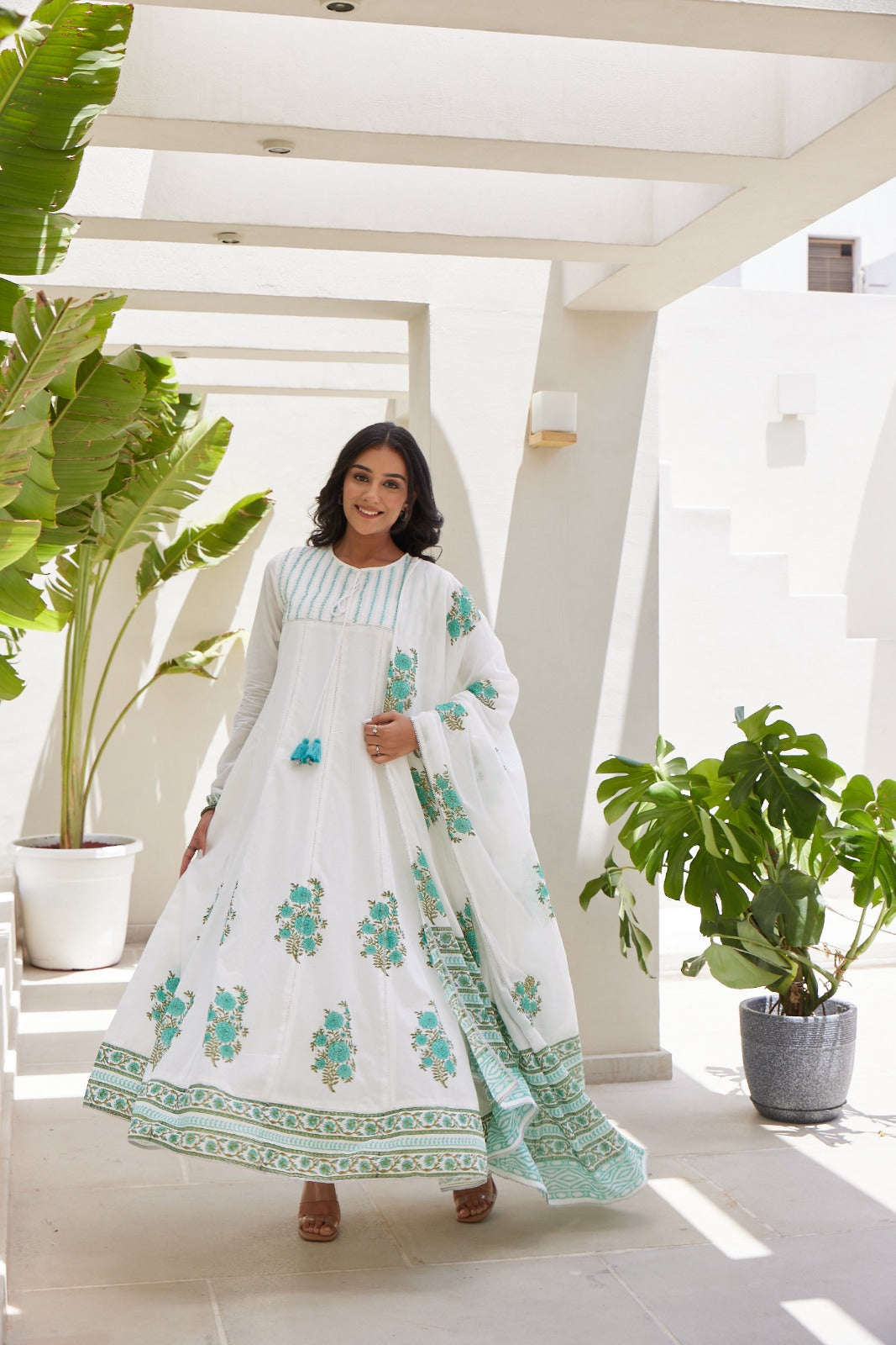 Pure Cotton Hand Block Print Hand Embroidered Anarkali with Churidar Sleeves and Mul Cotton Block Print Dupatta