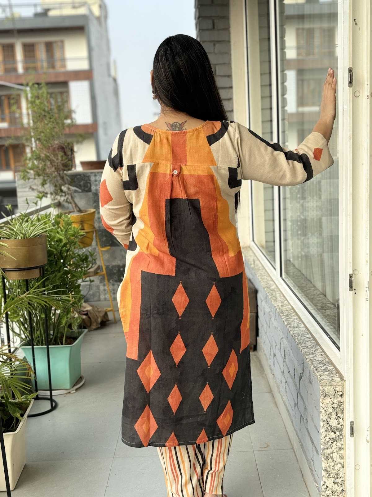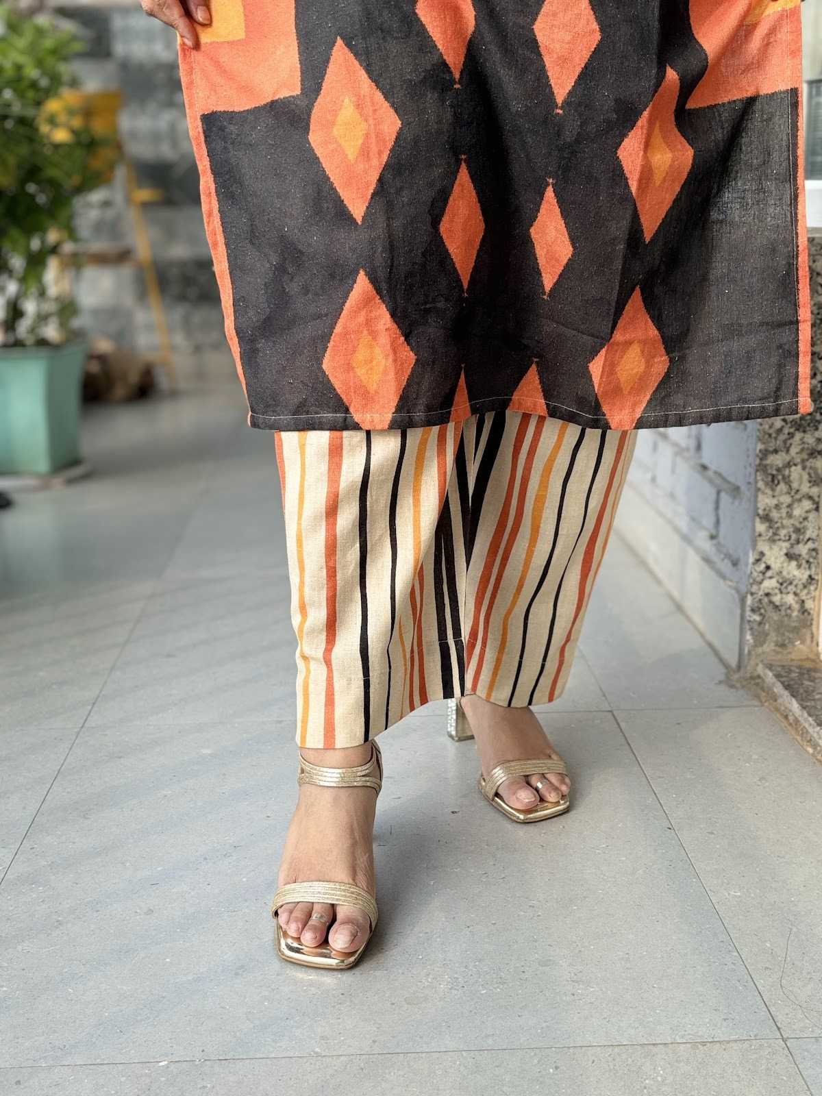 Pure Linen Cotton Digital Print Designer Pant Set in Orange And Black