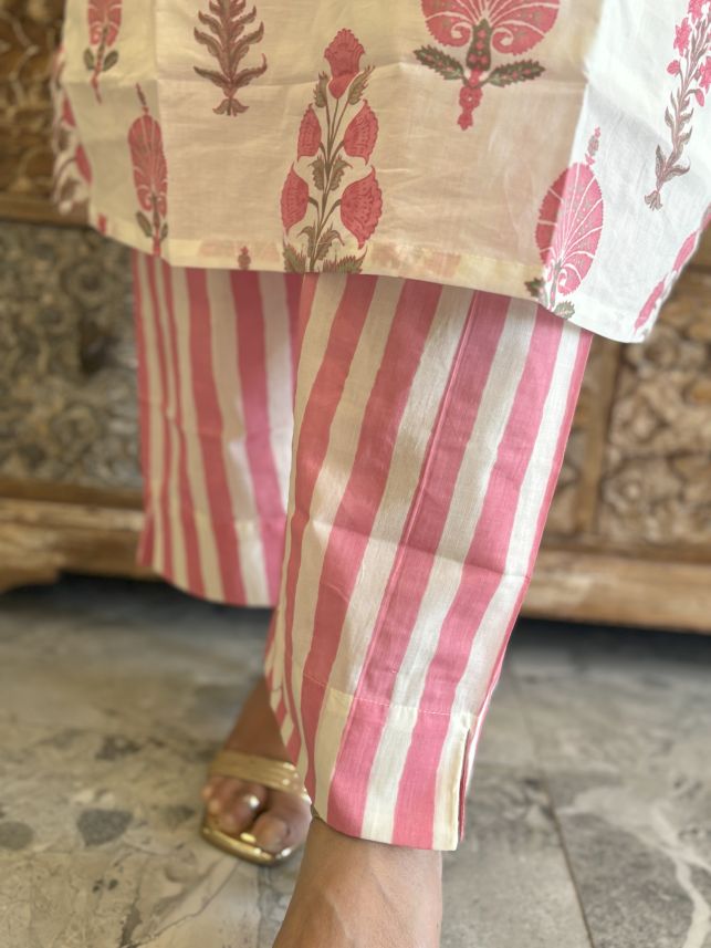 Pure Cotton Block Print Pant Set With Striped Cotton Pants in Pink