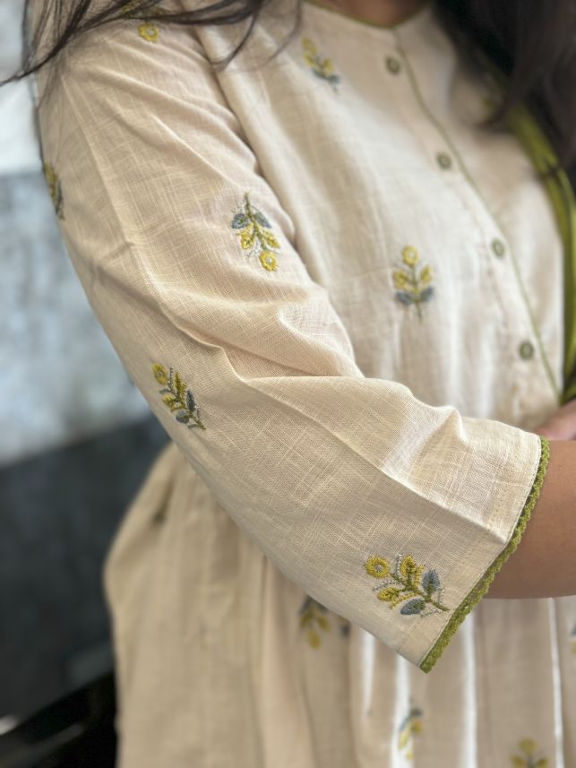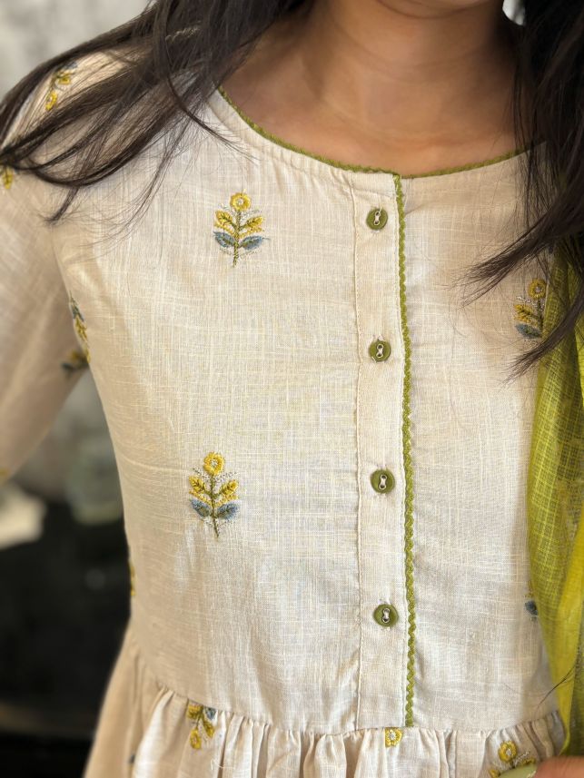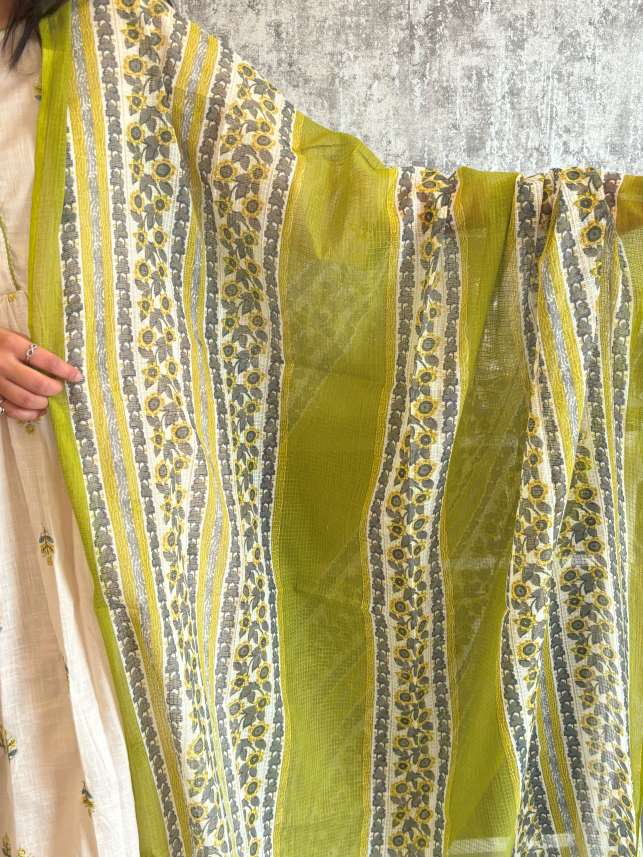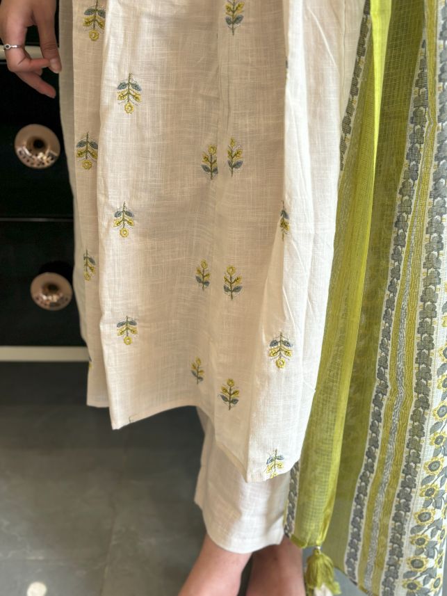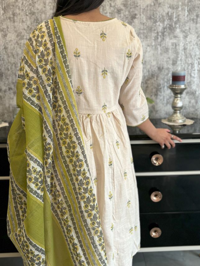 Pure Cotton Slub Embroidered Suit Set With Pure Kota Check Dupatta in Beige and Green